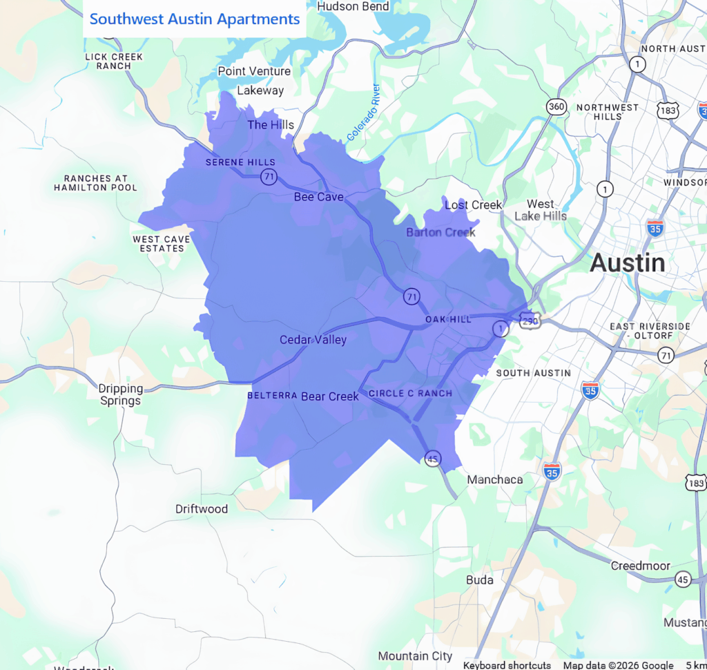 Here’s what I tell clients about Southwest Austin: you’re trading downtown walkability for Hill Country terrain, newer construction, and breathing room. Most properties here were built after 2000. Some opened in 2024-2025. You get actual views (not just other apartment buildings), proximity to Barton Creek Greenbelt and Circle C trails, and reasonable commutes to downtown (15-25 minutes off-peak via MoPac) or the Domain (25-30 minutes via 183).